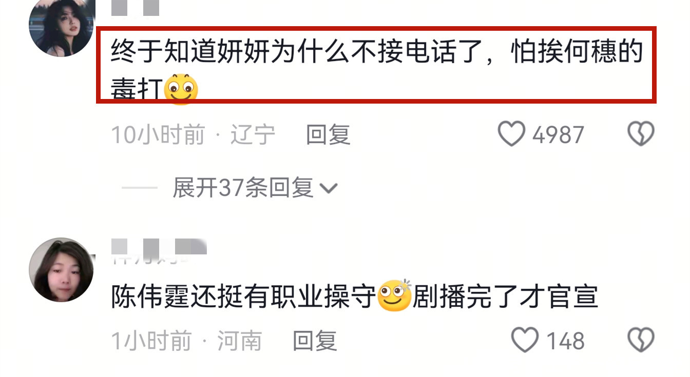有网友说“终于知道妍妍为什么不接电话了,怕挨何穗毒打。”