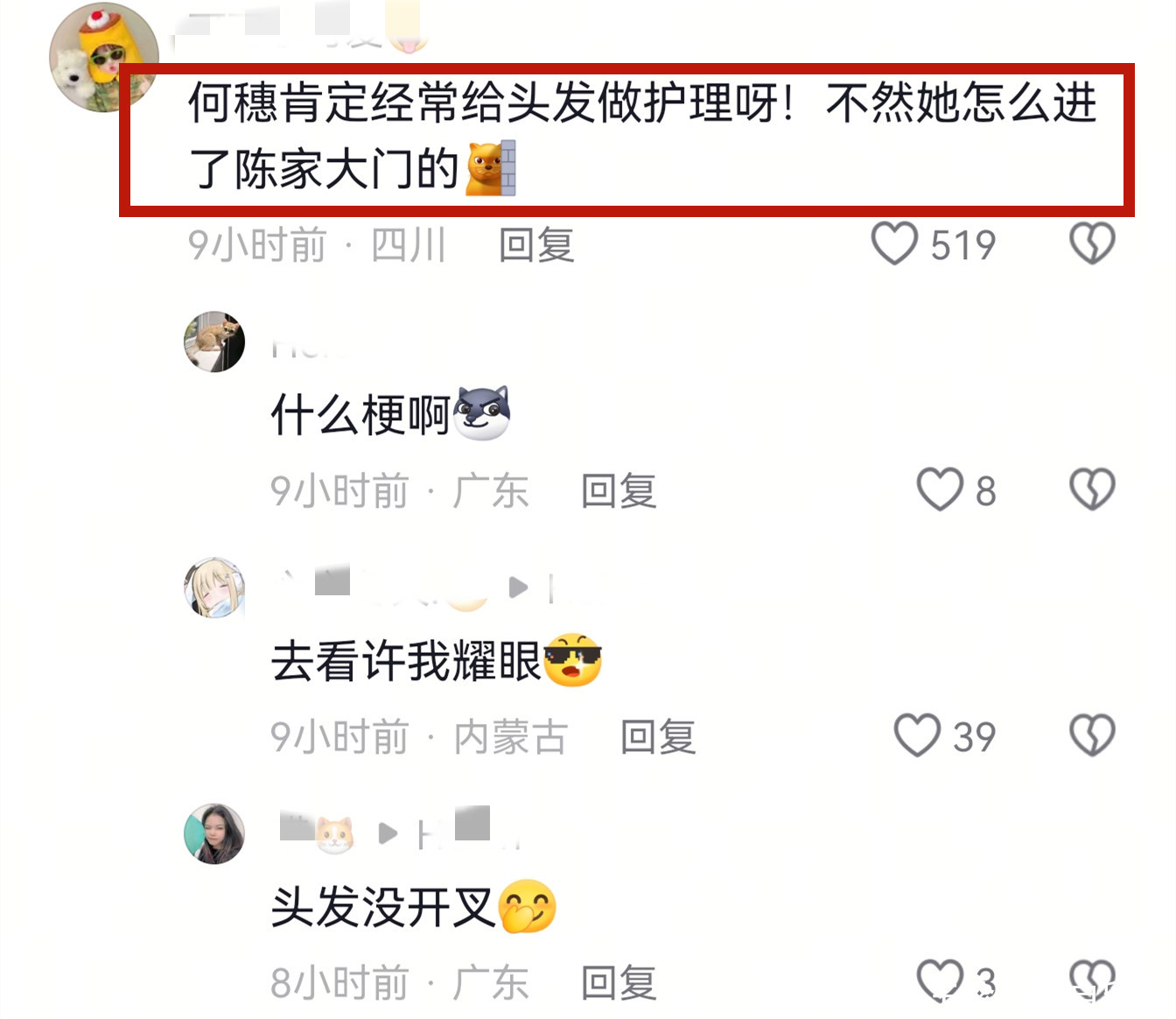 有网友说“何穗肯定经常给头发做护理呀,不然她怎么进了陈家大门。”